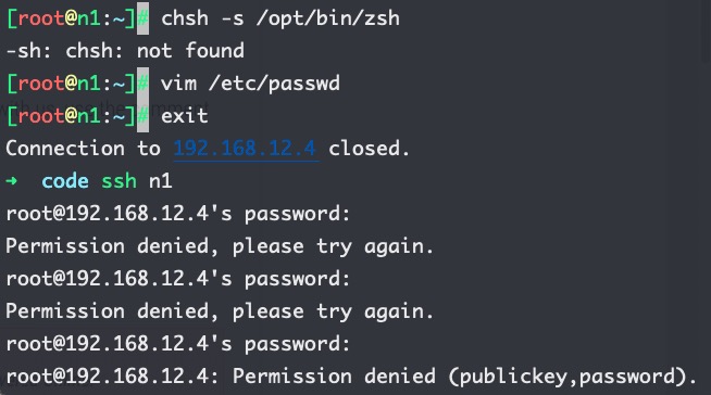 然后网上找其它方法,看到有个是修改 /etc/passwd 这个文件,第一行就是 root 用户的默认 shell 路径,于是用 vim 修改这个文件,改为 zsh 的路径,然后退出,再重新 ssh 连接,就登录不了了……